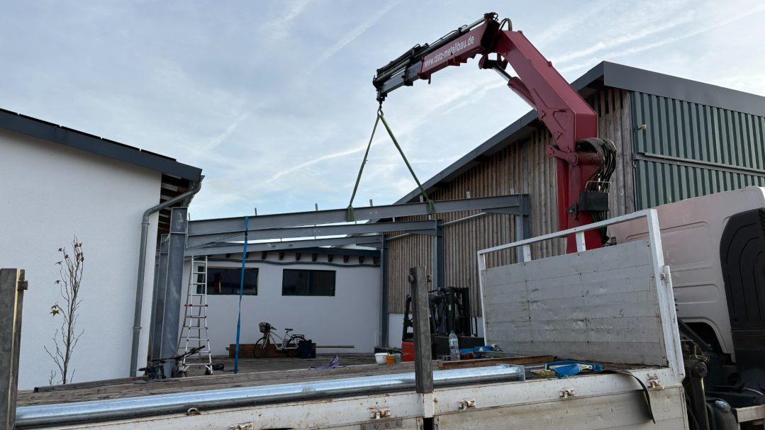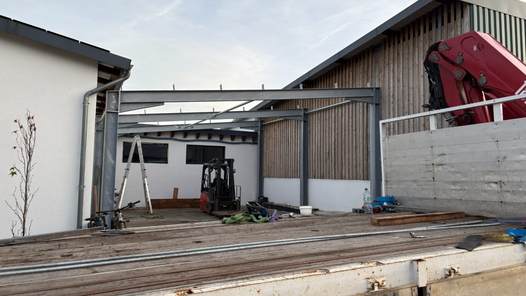 Im Zuge dieses Bauvorhabens wurde eine Stahlhalle als Erweiterung realisiert. Eine besondere Herausforderung ergab sich aus der baulichen Situation: Die Halle ist von drei Seiten umschlossen, wodurch nur minimale Fertigungstoleranzen zulässig waren. Maßabweichungen hätten sich unmittelbar auf die Passgenauigkeit ausgewirkt.